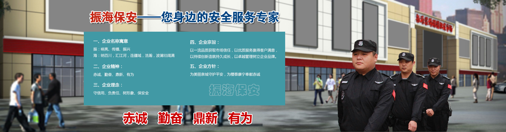 山東振海保安服務有限公司是一家專業(yè)的保安服務公司,提供人防安保、臨時勤務安保、危機處理安保、犬防安保、反跟蹤、調查、商業(yè)間諜等服務,公司成立于2015年5月,是通過國家公安部門資質認證,經(jīng)山東省公安廳和濟南市工商局批準成立的綜合性民營保安公司。公司立足濟南,面向山東省內(nèi)外,開展的業(yè)務涵蓋人防、技防、安檢、守護、隨身護衛(wèi)、大型活動特勤等安保項目。公司總部坐落于濟南市市中區(qū)英雄山立交樞紐南側振海裝飾材料市場大樓;公司培訓基地位于濟南市南部山區(qū)。